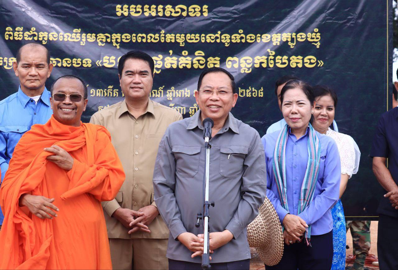 ឯកឧត្តម រដ្ឋមន្ត្រីបានមានប្រសាសន៍ថា ពិធីដាំកូនឈើចំនួន១៥០០ដើមនៅក្នុងបរិវេណព្រៃសហគមន៍កំពែង ស្ថិតក្នុងភូមិខ្ជាយ ឃុំតំបែរ ស្រុកតំបែរ ខេត្តត្បូងឃ្មុំ ក្រោមប្រធានបទ”បណ្តុះគំនិត ពន្លកបៃតង” នាពេលនេះបានប្រារព្ធឡើងក្រោមម្លប់នៃសន្តិភាព នៃការដឹកនាំដ៏ឆ្លាតវៃប្រកបដោយគិត្តិបណ្ឌិតរបស់ រាជរដ្ឋាភិបាលអាណិត្តទី៦ ក្រោមការដឹកនាំរបស់សម្តេអគ្គមហាសេនាបតីតេជោ ហ៊ុន សែន នឹងបានបន្តដឹកនាំដោយរាជរដ្ឋាភិបាលអាណិត្តទី៧ ក្រោមការដឹកនាំរបស់សម្តេចមហាបវរធិបតីហ៊ុន ម៉ាណែត នាយករដ្ឋមន្រ្តីនៃព្រះរាជាណាចក្រកម្ពុជា បានធ្វើឲ្យប្រទេសឈរលើមាគ៌ាដ៏ត្រឹមត្រូវឆ្ពោះទៅសម្រេចបាននូវចក្ខុវិស័យ ប្រែក្លាយជាប្រទេសដែលមានចំណូលមធ្យមកម្រិតខ្ពស់នៅឆ្នាំ ២០៣០ និង បន្តទៅសម្រេចបានជាប្រទេសដែលមានចំណូលខ្ពស់នៅឆ្នាំ ២០៥០ ស្របទៅនិងគោលនយោបាយយុទ្ធសាស្ត្របញ្ចកោណដំណាក់កាលទី១ និងកម្មវិធីនយោបាយអាទិភាពរបស់រាជរដ្ឋាភិបាលទាំង ៦ និងវិធានការគន្លឹះ ៥ ស្ដីពីផែនការយុទ្ធសាស្ត្រអភិវឌ្ឍន៍ជាតិ គោលនយោបាយនិងកម្មវិធីកំណែទម្រង់នានារបស់រាជរដ្ឋាភិបាល ដើម្បីជំរុញល្បឿននៃការអភិវឌ្ឍន៍ជាតិឲ្យទទួលបានភាពជោគជ័យប្រកបដោយចីរភាព។